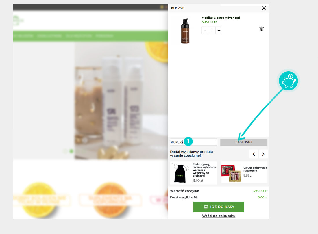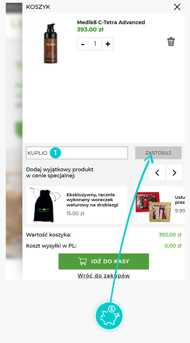 Wybierz produkt w e-sklepie Sklep.lemone.pl który Cię interesuje, naciśnij przycisk "Kup", a produkt zostanie automatycznie dodany do koszyka. Bezpośrednio w koszyku znajdziesz pole „Kupon podarunkowy lub rabatowy” pod wybranym produktem. Wpisz tutaj skopiowany kod rabatowy lub wprowadź go ręcznie i potwierdź przyciskiem „Zastosuj”.