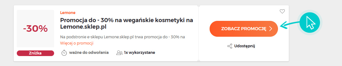 Wybierz konkretny rabat Lemone na naszej stronie i kliknij przycisk "Zobacz promocje". Zostaniesz automatycznie przekierowany bezpośrednio do oferty specjalnej w sklepie internetowym Sklep.lemone.pl, w którym możesz kupić produkt ze zniżką.