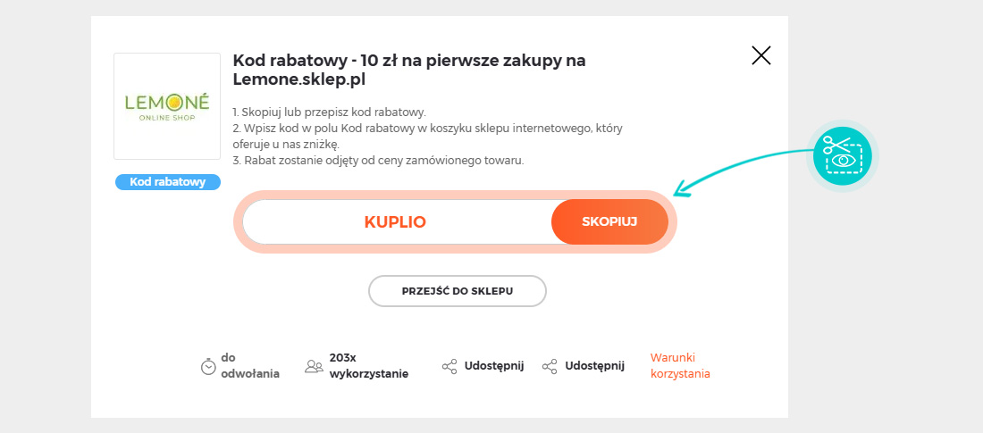 Skopiuj lub zapisz kod rabatowy i kliknij przycisk "Przejdź do sklepu". Nastąpi przekierowanie bezpieśrednio do sklepu internetowego Sklep.lemone.pl.