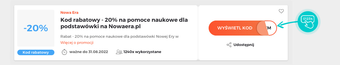 Wybierz na naszej stronie określony kod rabatowy, który chcesz zastosować w sklepie internetowym Nowaera.pl. Kliknij pomarańczowy przycisk „Wyświetl kod”.