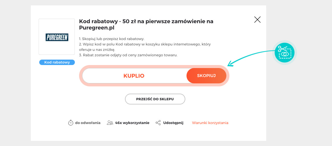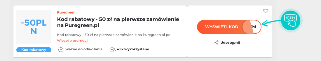 Wybierz na naszej stronie określony kod rabatowy, który chcesz zastosować w sklepie internetowym Sklep.puregreen.pl. Kliknij pomarańczowy przycisk „Wyświetl kod”.