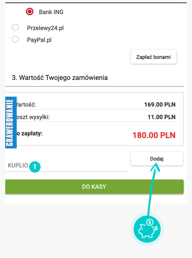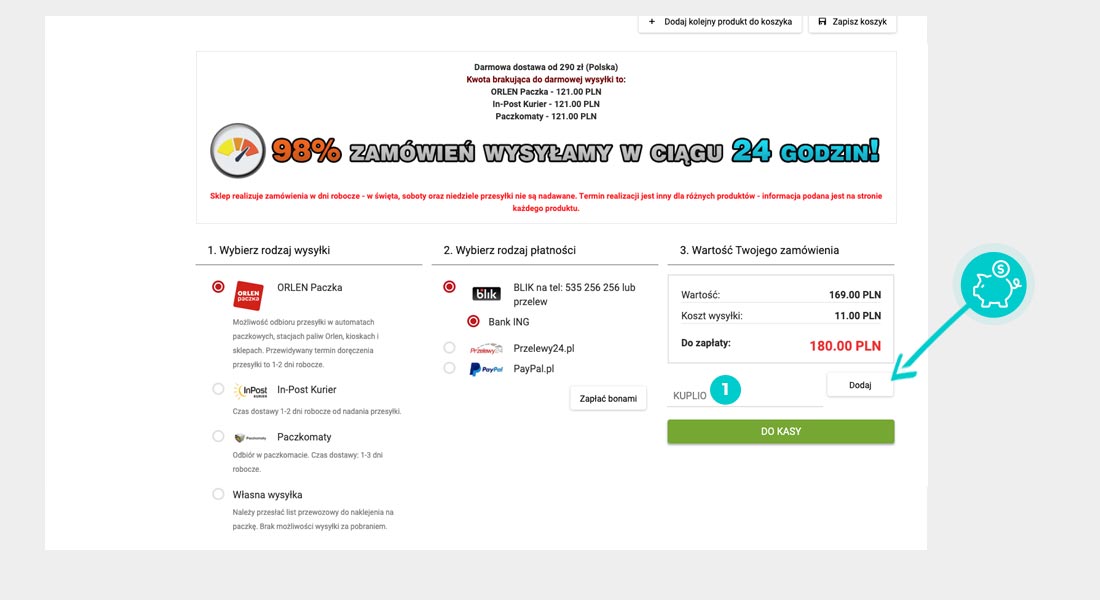 Wybierz produkt w e-sklepie Sklep.puregreen.pl który Cię interesuje, naciśnij przycisk "Kup", a produkt zostanie automatycznie dodany do koszyka. Bezpośrednio w koszyku znajdziesz pole „Kupon podarunkowy lub rabatowy” pod wybranym produktem. Wpisz tutaj skopiowany kod rabatowy lub wprowadź go ręcznie i potwierdź przyciskiem „Zastosuj”.