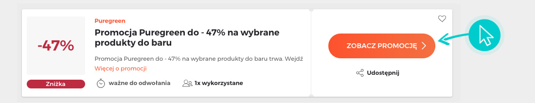 Wybierz konkretny rabat Puregreen na naszej stronie i kliknij przycisk "Zobacz promocje". Zostaniesz automatycznie przekierowany bezpośrednio do oferty specjalnej w sklepie internetowym Sklep.puregreen.pl, w którym możesz kupić produkt ze zniżką.