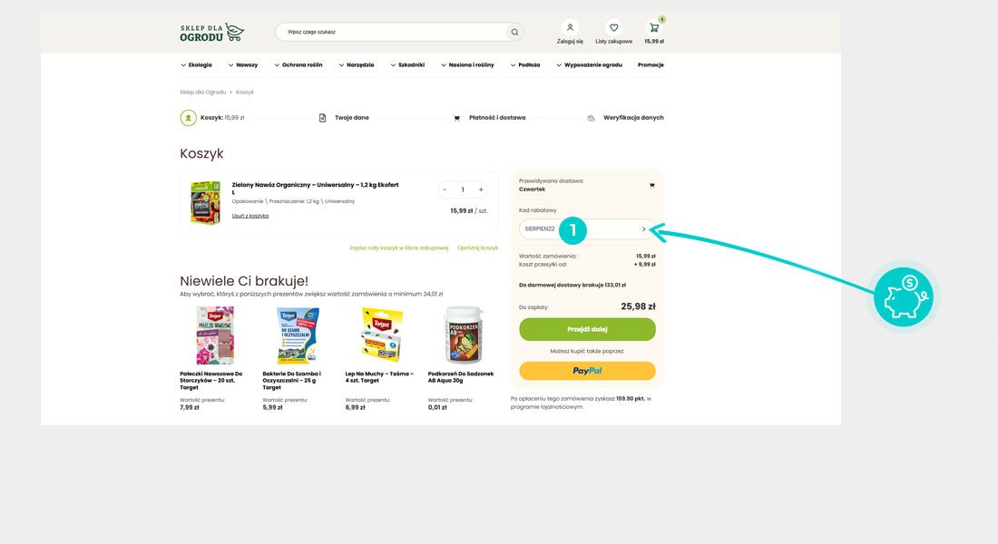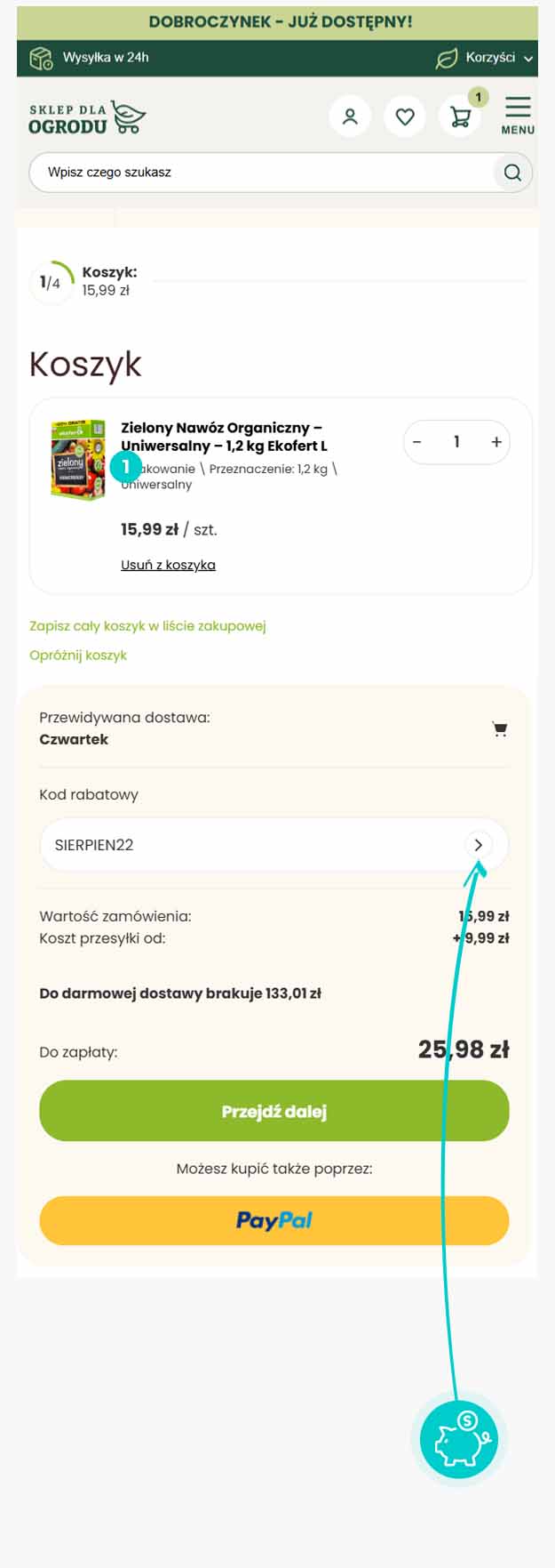 Wybierz produkt w e-sklepie Sklepdlaogrodu.pl który Cię interesuje, naciśnij przycisk "Kup", a produkt zostanie automatycznie dodany do koszyka. Bezpośrednio w koszyku znajdziesz pole „Kupon podarunkowy lub rabatowy” pod wybranym produktem. Wpisz tutaj skopiowany kod rabatowy lub wprowadź go ręcznie i potwierdź przyciskiem „Zastosuj”.