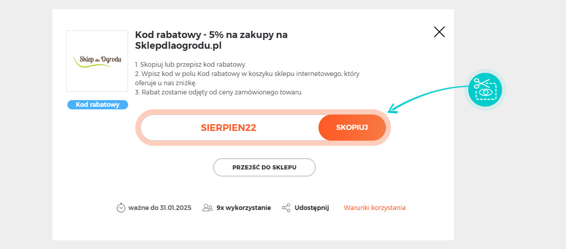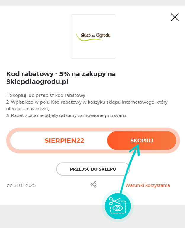 Skopiuj lub zapisz kod rabatowy i kliknij przycisk "Przejdź do sklepu". Nastąpi przekierowanie bezpieśrednio do sklepu internetowego Sklepdlaogrodu.pl.