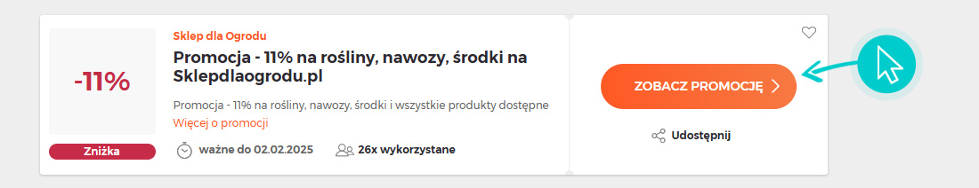 Wybierz konkretny rabat Sklep dla Ogrodu na naszej stronie i kliknij przycisk "Zobacz promocje". Zostaniesz automatycznie przekierowany bezpośrednio do oferty specjalnej w sklepie internetowym Sklepdlaogrodu.pl, w którym możesz kupić produkt ze zniżką.