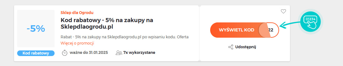 Wybierz na naszej stronie określony kod rabatowy, który chcesz zastosować w sklepie internetowym Sklepdlaogrodu.pl. Kliknij pomarańczowy przycisk „Wyświetl kod”.