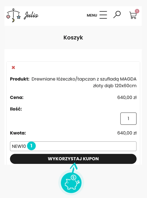Wybierz w e-sklepie Sklep-julia.pl produkt, który Cię interesuje, naciśnij przycisk "Do koszyka", a produkt automatycznie zostanie dodany do Twojego koszyka z zamówieniem. Po prawej stronie, w sekcji "Zamówienie" znajdziesz pole "Masz kupon?". Tutaj wklej skopiowany kod rabatowy bądź wprowadź go ręcznie, i zatwierdź przyciskiem "Wykorzystaj kupon", a następnie "Kupuję i płacę".