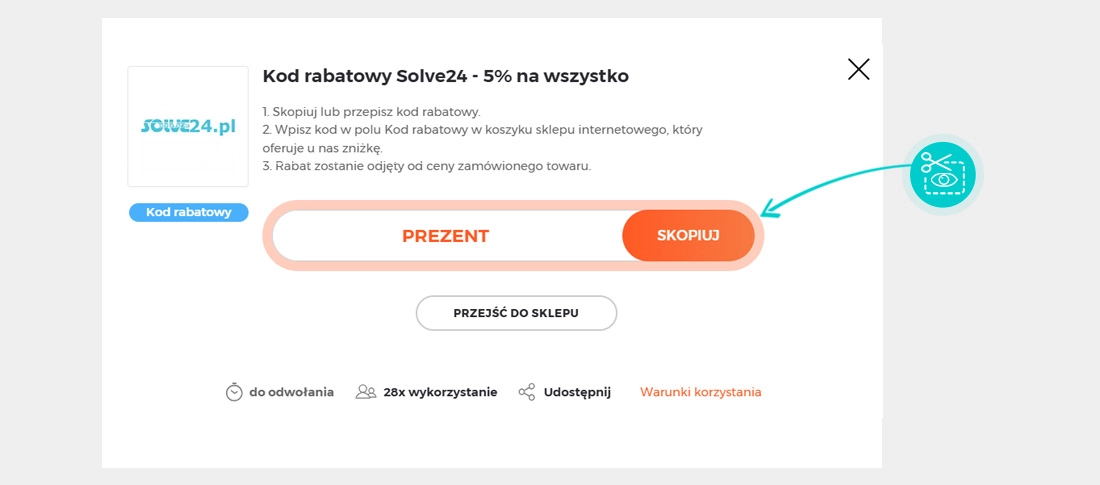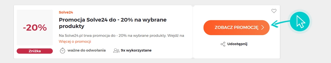 Wybierz konkretny rabat Solve24 na naszej stronie i kliknij przycisk "Zobacz promocje". Zostaniesz automatycznie przekierowany bezpośrednio do oferty specjalnej w sklepie internetowym Solve24.pl, w którym możesz kupić produkt ze zniżką.