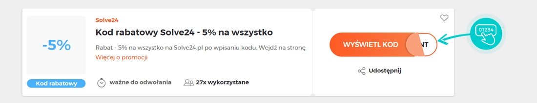 Wybierz na naszej stronie określony kod rabatowy, który chcesz zastosować w sklepie internetowym Solve24.pl. Kliknij pomarańczowy przycisk „Wyświetl kod”.