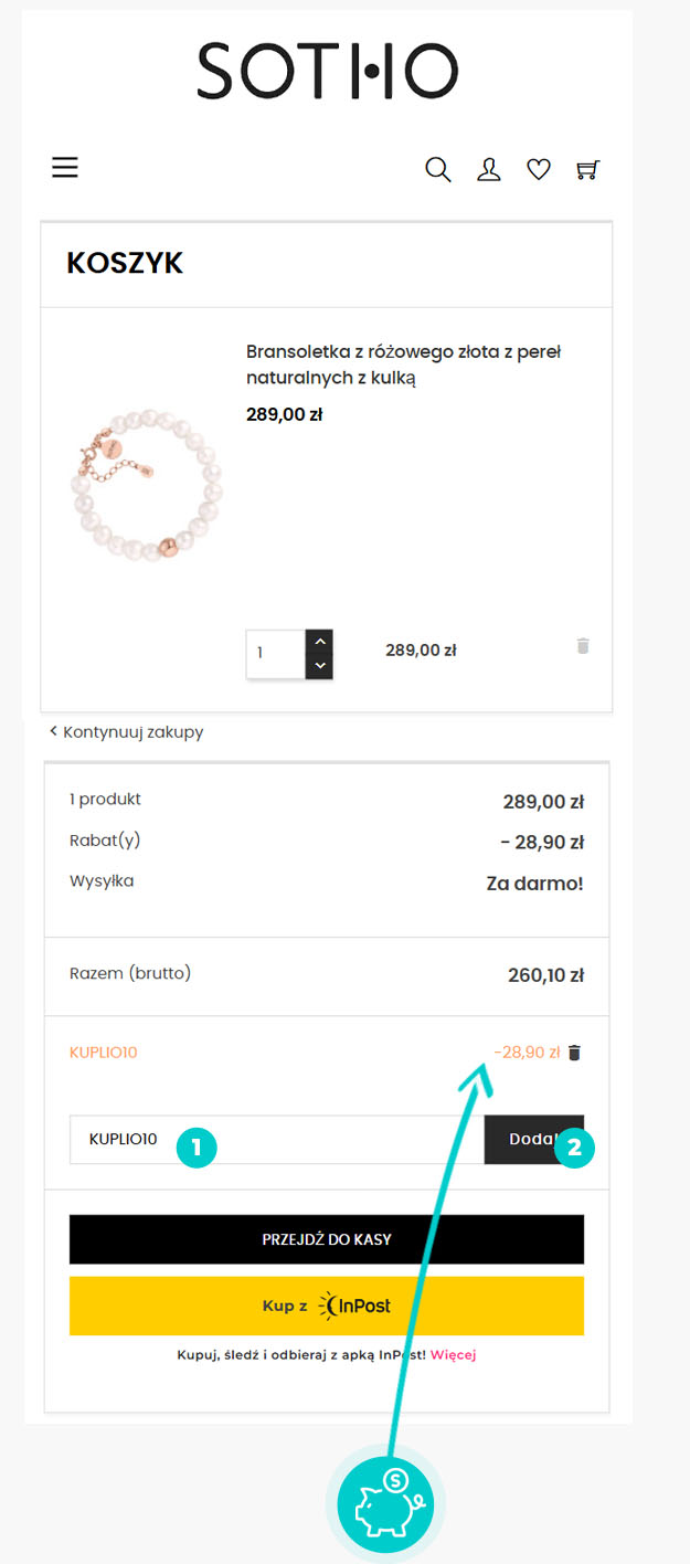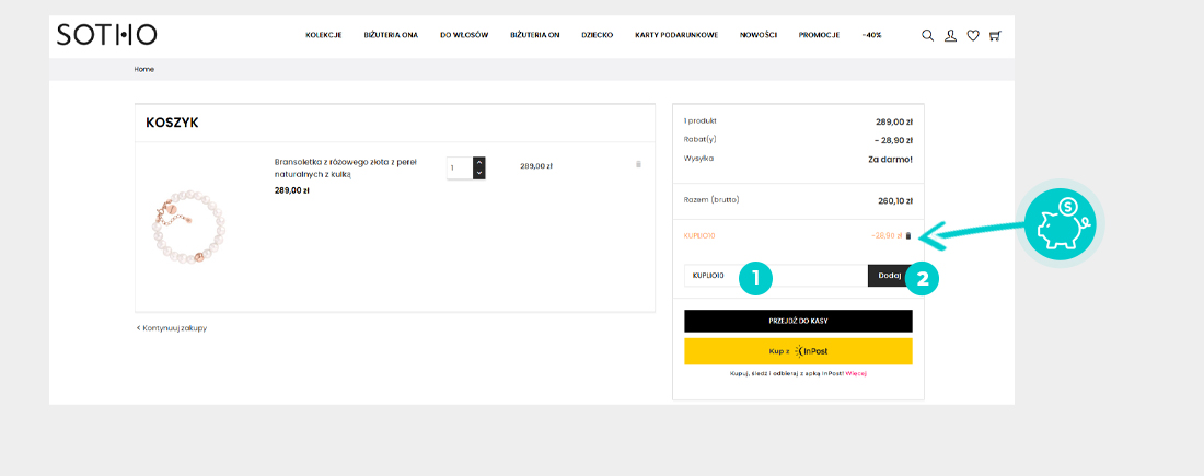 Wybierzcie w e-sklepie Sotho.pl produkt, który was interesuje, naciśnijcie przycisk "Dodaj do koszyka", a produkt automatycznie zostanie dodany do waszego koszyka z zamówieniem. Po prawej stronie, w sekcji "Koszyk" znajdziecie pole "Kod promocyjny". Tutaj wklejcie skopiowany kod rabatowy bądź wprowadźcie go ręcznie, i zatwierdźcie przyciskiem "Dodaj", a następnie "Przejdź do kasy".