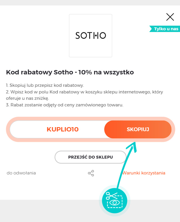 Skopiujcie lub zapiszcie kod rabatowy, a następnie kliknijcie przycisk "Przejdź do sklepu". Zostaniecie automatycznie przekierowani do sklepu internetowego Sotho.pl.