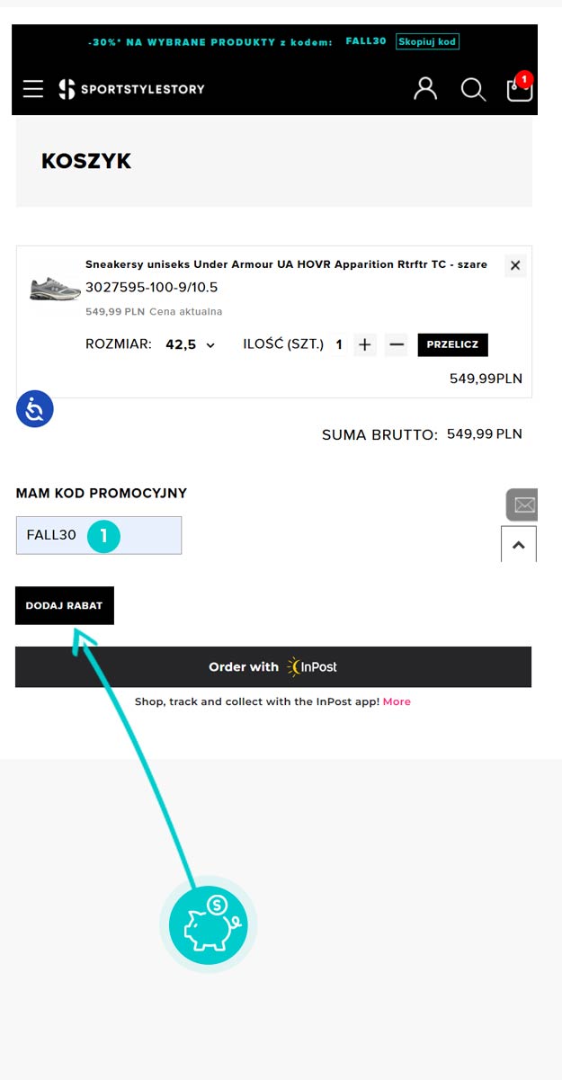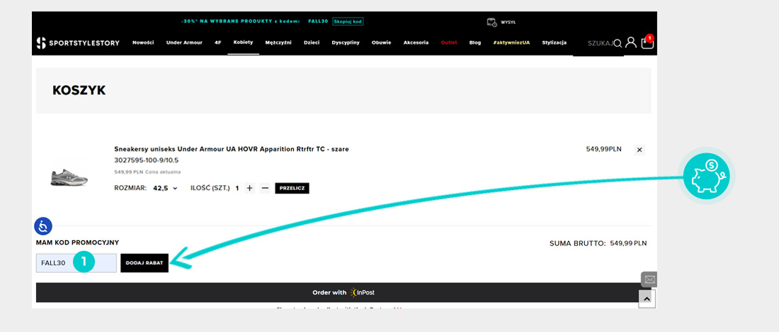 Wybierz w e-sklepie Sportstylestory.com produkt, który Cię interesuje, naciśnij przycisk "Dodaj do koszyka", a produkt automatycznie zostanie dodany do Twojego koszyka z zamówieniem. Po prawej stronie, w sekcji "Koszyk" znajdziesz pole "Mam kod promocyjny". Tutaj wklej skopiowany kod rabatowy bądź wprowadź go ręcznie, i zatwierdź przyciskiem, a następnie zaznacz "Kontynuuj".