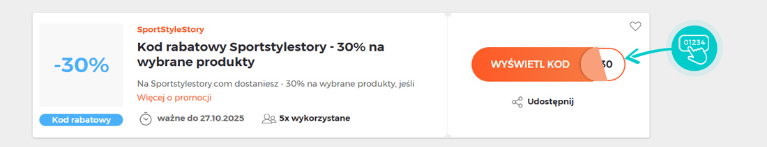 Wybierz na naszej stronie konkretny kod rabatowy, którego chcesz użyć w sklepie internetowym Sportstylestory.com. Następnie kliknij pomarańczowy przycisk "Wyświetl kod".