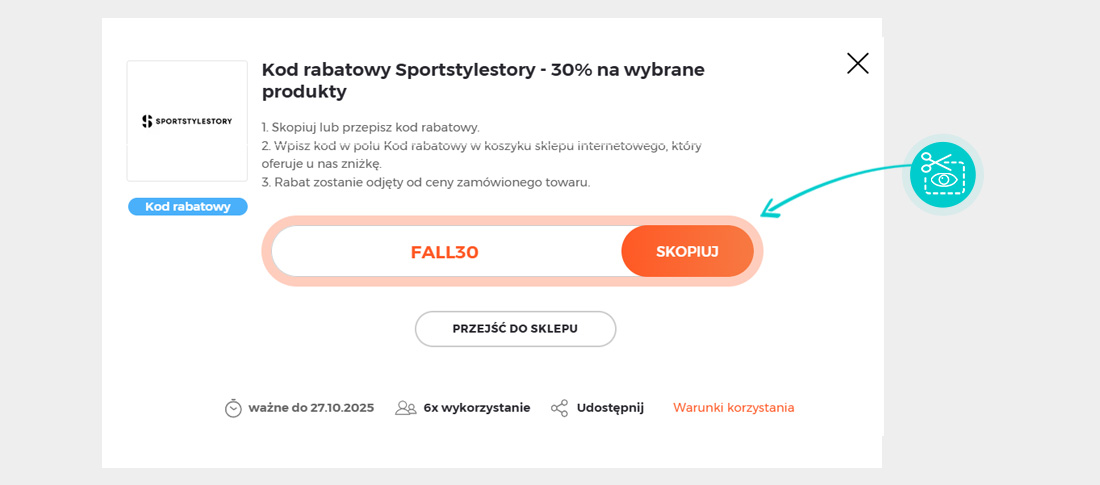 Skopiuj lub zapisz kod rabatowy, a następnie kliknij przycisk "Przejdź do sklepu". Zostaniesz automatycznie przekierowany do sklepu internetowego Sportstylestory.com.