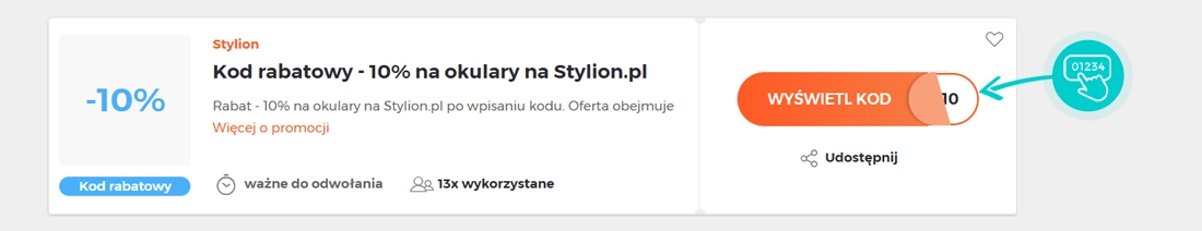 Wybierz na naszej stronie określony kod rabatowy, który chcesz zastosować w sklepie internetowym Stylion.pl. Kliknij pomarańczowy przycisk „Wyświetl kod”.