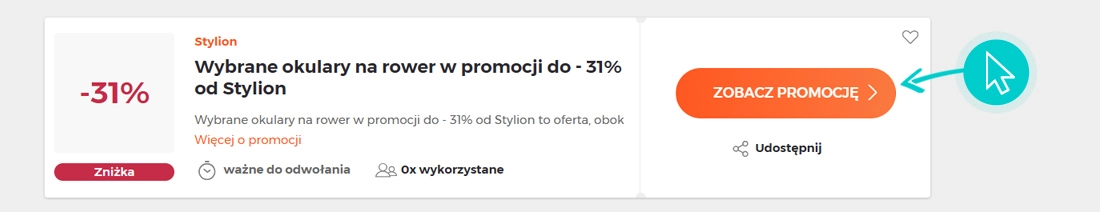 Wybierz konkretny rabat Stylion na naszej stronie i kliknij przycisk "Zobacz promocje". Zostaniesz automatycznie przekierowany bezpośrednio do oferty specjalnej w sklepie internetowym Stylion.pl, w którym możesz kupić produkt ze zniżką.