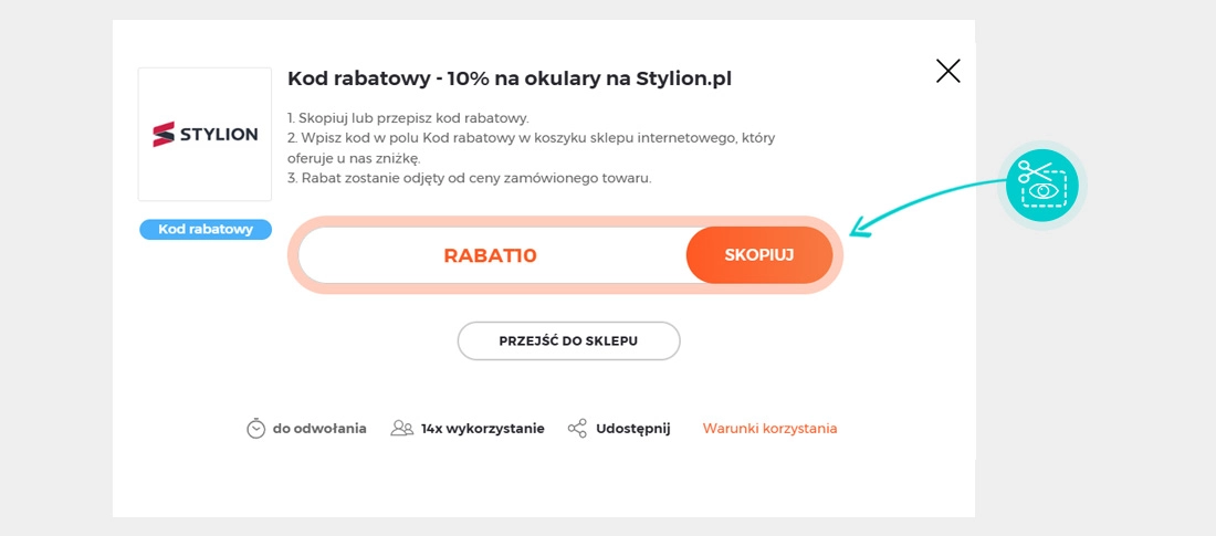 Skopiuj lub zapisz kod rabatowy i kliknij przycisk "Przejdź do sklepu". Nastąpi przekierowanie bezpieśrednio do sklepu internetowego Stylion.pl.
