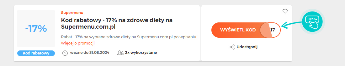 Wybierz na naszej stronie konkretny kod rabatowy, którego chcesz użyć w sklepie internetowym Supermenu.com.pl. Następnie kliknij pomarańczowy przycisk "Wyświetl kod".
