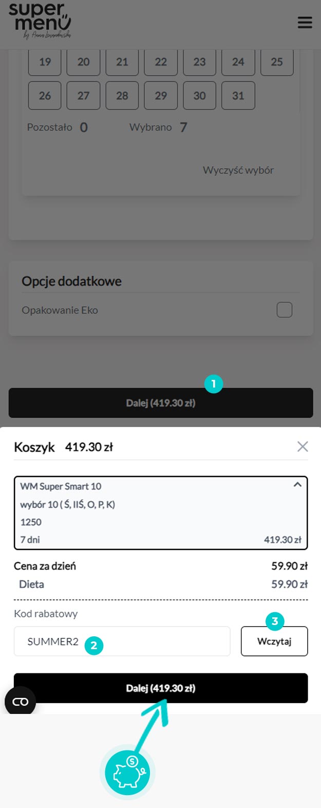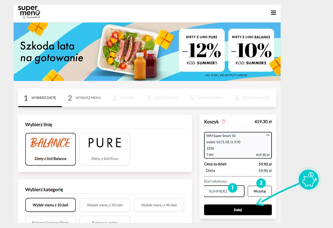 Wybierz w e-sklepie Supermenu.com.pl produkt, który Cię interesuje, naciśnij przycisk "Dodaj do koszyka", a produkt automatycznie zostanie dodany do Twojego koszyka z zamówieniem. Po prawej stronie, w sekcji "Twój koszyk" znajdziesz pole "Kod rabatowy". Tutaj wklej skopiowany kod rabatowy bądź wprowadź go ręcznie, i zatwierdź przyciskiem "Wczytaj", a następnie "Dalej".