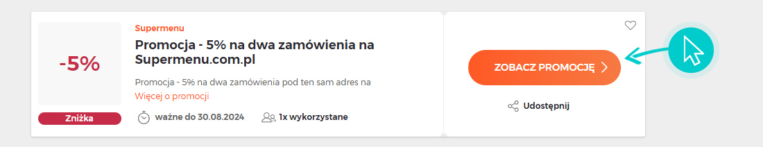 Wybierz konkretny rabat z Super Menu na naszej stronie i kliknij przycisk "Zobacz promocję". Zostaniesz automatycznie przekierowany do oferty promocyjnej w sklepie internetowym Supermenu.com.pl, gdzie możesz kupić wybrany produkt ze świetną zniżką.