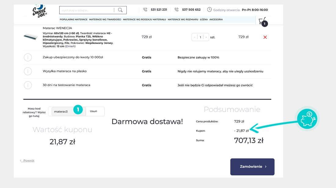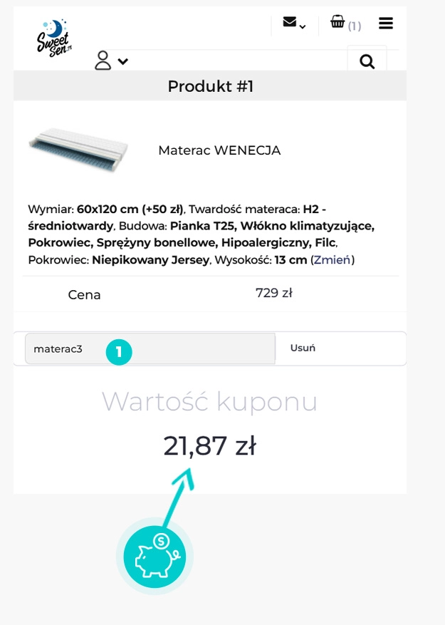 Wybierz produkt w e-sklepie Sweetsen.pl który Cię interesuje, naciśnij przycisk "Kup", a produkt zostanie automatycznie dodany do koszyka. Bezpośrednio w koszyku znajdziesz pole „Kupon podarunkowy lub rabatowy” pod wybranym produktem. Wpisz tutaj skopiowany kod rabatowy lub wprowadź go ręcznie i potwierdź przyciskiem „Zastosuj”.