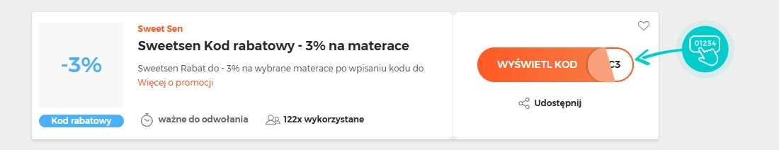 Wybierz na naszej stronie określony kod rabatowy, który chcesz zastosować w sklepie internetowym Sweetsen.pl. Kliknij pomarańczowy przycisk „Wyświetl kod”.