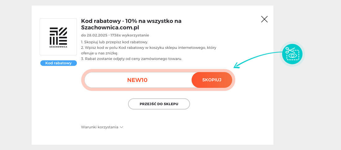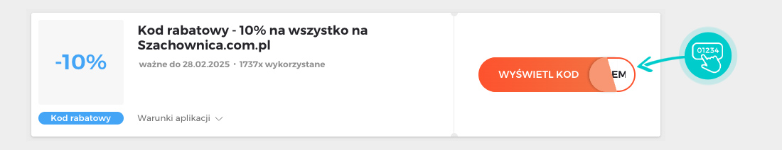 Wybierz na naszej stronie określony kod rabatowy, który chcesz zastosować w sklepie internetowym Szachownica.com.pl. Kliknij pomarańczowy przycisk „Wyświetl kod”.