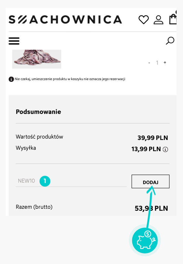 Wybierz produkt w e-sklepie Szachownica.com.pl który Cię interesuje, naciśnij przycisk "Kup", a produkt zostanie automatycznie dodany do koszyka. Bezpośrednio w koszyku znajdziesz pole „Kupon podarunkowy lub rabatowy” pod wybranym produktem. Wpisz tutaj skopiowany kod rabatowy lub wprowadź go ręcznie i potwierdź przyciskiem „Zastosuj”.