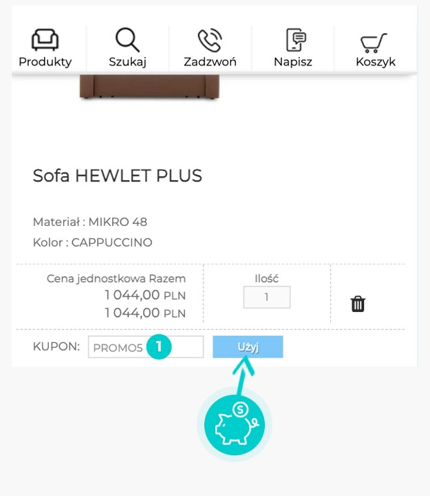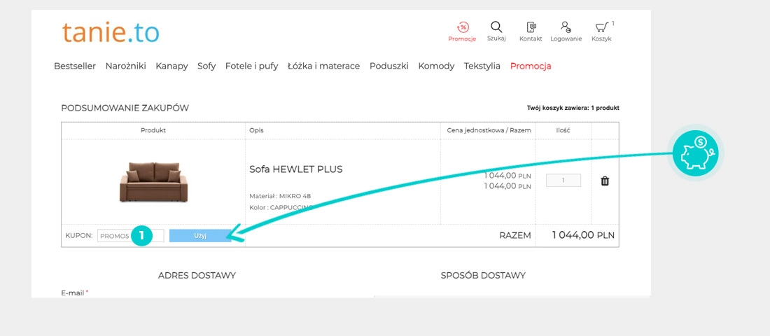 Wybierz produkt w e-sklepie Tanie.to który Cię interesuje, naciśnij przycisk "Kup", a produkt zostanie automatycznie dodany do koszyka. Bezpośrednio w koszyku znajdziesz pole „Kupon podarunkowy lub rabatowy” pod wybranym produktem. Wpisz tutaj skopiowany kod rabatowy lub wprowadź go ręcznie i potwierdź przyciskiem „Zastosuj”.