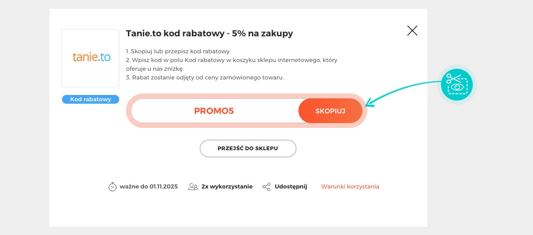 Wybierz konkretny rabat Tanie.to na naszej stronie i kliknij przycisk "Zobacz promocje". Zostaniesz automatycznie przekierowany bezpośrednio do oferty specjalnej w sklepie internetowym Tanie.to, w którym możesz kupić produkt ze zniżką.