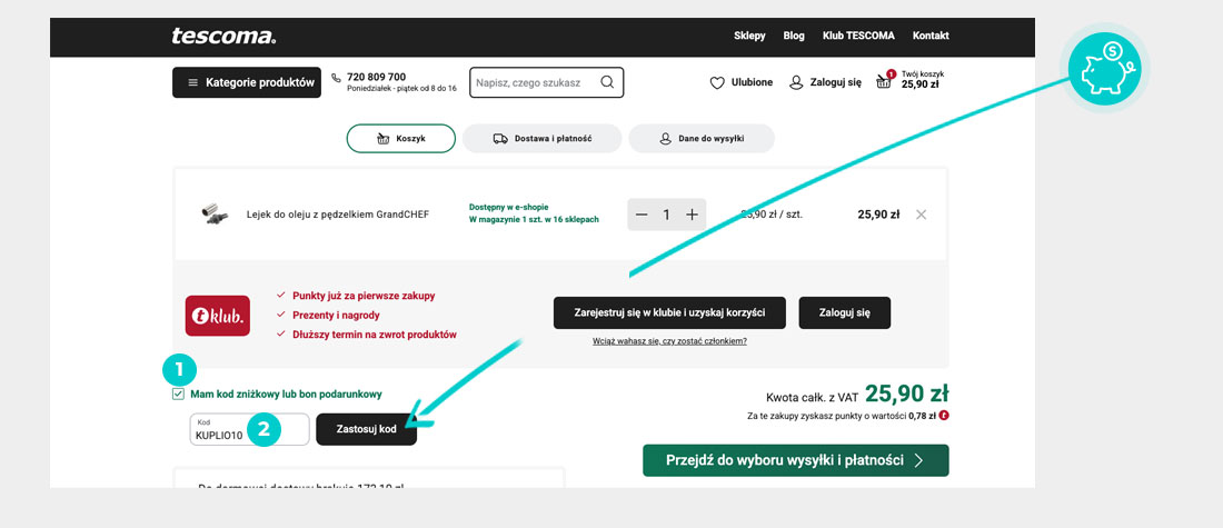 Wybierz produkt w e-sklepie Tescoma.pl który Cię interesuje, naciśnij przycisk "Kup", a produkt zostanie automatycznie dodany do koszyka. Bezpośrednio w koszyku znajdziesz pole „Kupon podarunkowy lub rabatowy” pod wybranym produktem. Wpisz tutaj skopiowany kod rabatowy lub wprowadź go ręcznie i potwierdź przyciskiem „Zastosuj”.