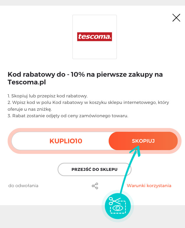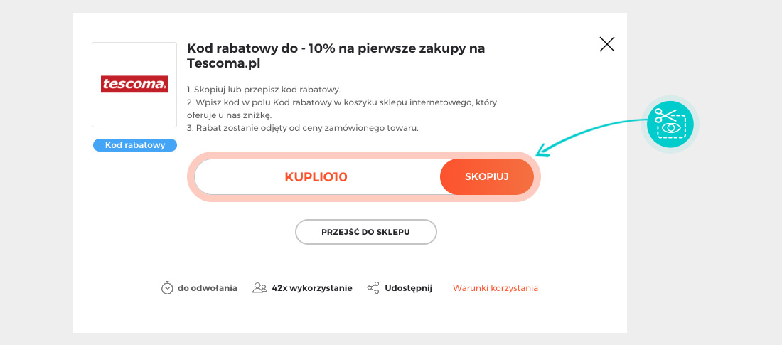 Skopiuj lub zapisz kod rabatowy i kliknij przycisk "Przejdź do sklepu". Nastąpi przekierowanie bezpieśrednio do sklepu internetowego Tescoma.pl.