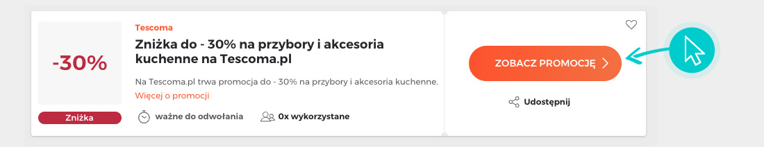 Wybierz konkretny rabat Tescoma na naszej stronie i kliknij przycisk "Zobacz promocje". Zostaniesz automatycznie przekierowany bezpośrednio do oferty specjalnej w sklepie internetowym Tescoma.pl, w którym możesz kupić produkt ze zniżką.