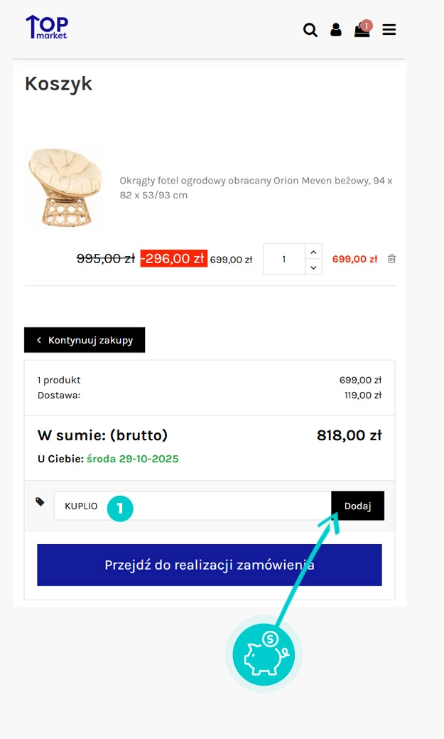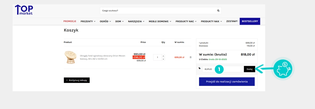 Wybierz produkt w e-sklepie Topmarket.pl który Cię interesuje, naciśnij przycisk "Kup", a produkt zostanie automatycznie dodany do koszyka. Bezpośrednio w koszyku znajdziesz pole „Kupon podarunkowy lub rabatowy” pod wybranym produktem. Wpisz tutaj skopiowany kod rabatowy lub wprowadź go ręcznie i potwierdź przyciskiem „Zastosuj”.