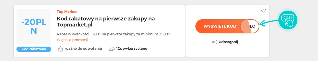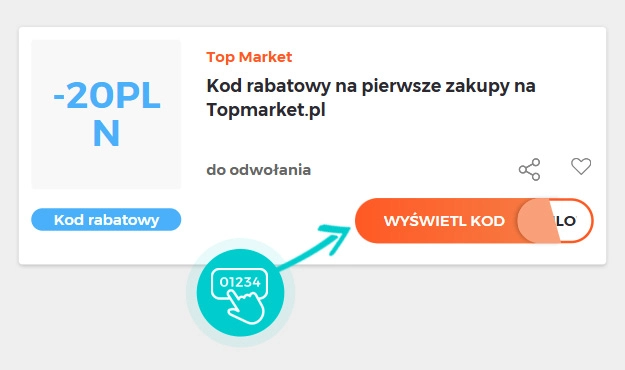 Wybierz na naszej stronie określony kod rabatowy, który chcesz zastosować w sklepie internetowym Topmarket.pl. Kliknij pomarańczowy przycisk „Wyświetl kod”.