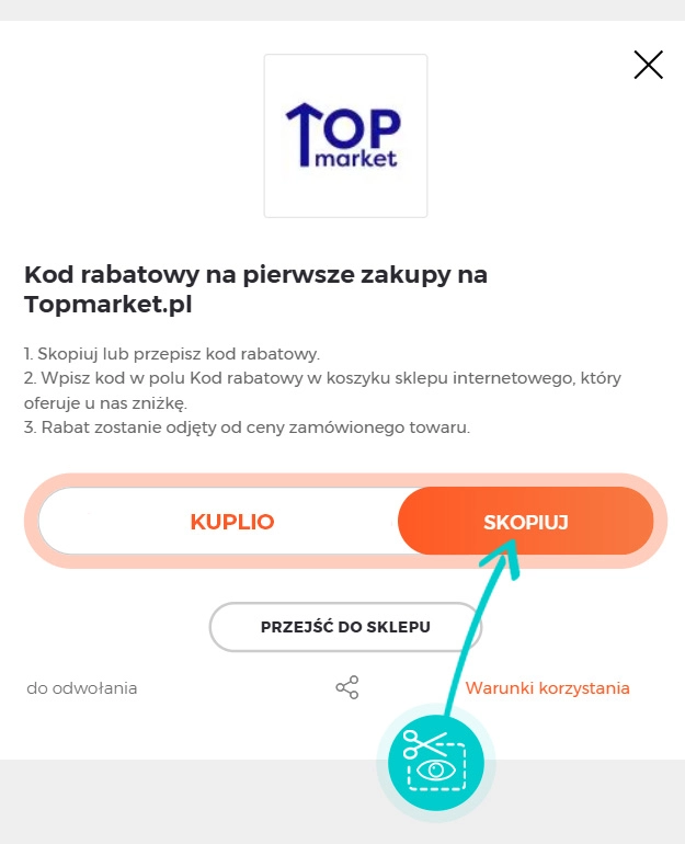 Skopiuj lub zapisz kod rabatowy i kliknij przycisk "Przejdź do sklepu". Nastąpi przekierowanie bezpieśrednio do sklepu internetowego Topmarket.pl.