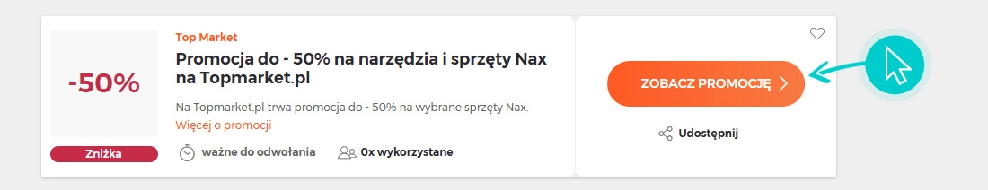 Wybierz konkretny rabat Top Market na naszej stronie i kliknij przycisk "Zobacz promocje". Zostaniesz automatycznie przekierowany bezpośrednio do oferty specjalnej w sklepie internetowym Topmarket.pl, w którym możesz kupić produkt ze zniżką.