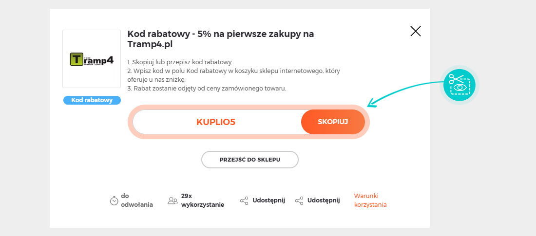 Wybierz na naszej stronie określony kod rabatowy, który chcesz zastosować w sklepie internetowym Tramp4.pl. Kliknij pomarańczowy przycisk „Wyświetl kod”.