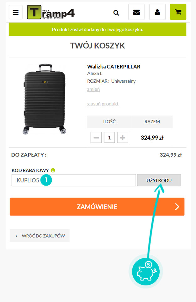 Wybierz produkt w e-sklepie Tramp4.pl który Cię interesuje, naciśnij przycisk "Kup", a produkt zostanie automatycznie dodany do koszyka. Bezpośrednio w koszyku znajdziesz pole „Kupon podarunkowy lub rabatowy” pod wybranym produktem. Wpisz tutaj skopiowany kod rabatowy lub wprowadź go ręcznie i potwierdź przyciskiem „Zastosuj”.