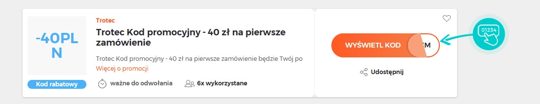 Wybierz na naszej stronie konkretny kod rabatowy, którego chcesz użyć w sklepie internetowym Trotec.com. Następnie kliknij pomarańczowy przycisk "Wyświetl kod".
