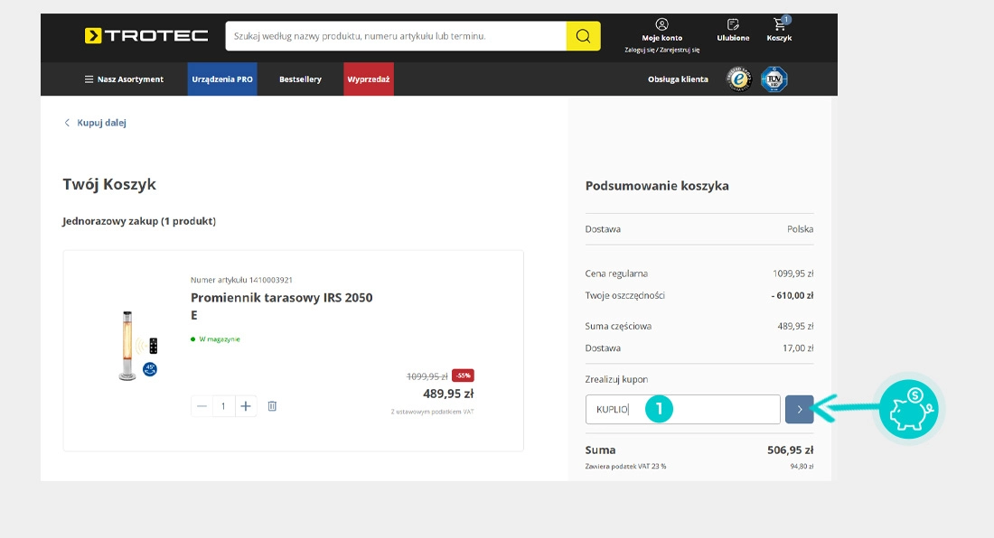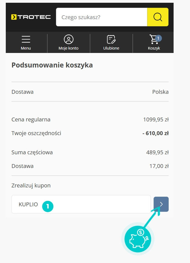 Wybierz w e-sklepie Trotec.com produkt, który Cię interesuje, naciśnij przycisk "Dodaj do koszyka", a produkt automatycznie zostanie dodany do Twojego koszyka z zamówieniem. Po prawej stronie, w sekcji "Twój Koszyk" znajdziesz pole "Kod rabatowy". Tutaj wklej skopiowany kod rabatowy bądź wprowadź go ręcznie, i zatwierdź przyciskiem, a następnie zaznacz "Zamówienie".
