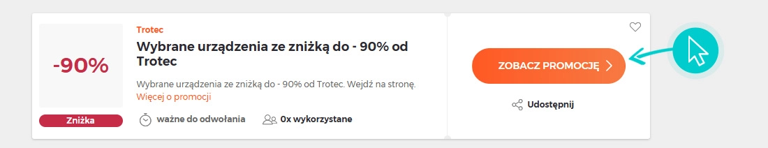 Wybierz konkretny rabat z Trotec na naszej stronie i kliknij przycisk "Zobacz promocję". Zostaniesz automatycznie przekierowany do oferty promocyjnej w sklepie internetowym Trotec.com, gdzie możesz kupić wybrany produkt ze świetną zniżką.