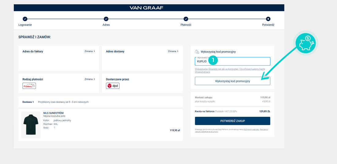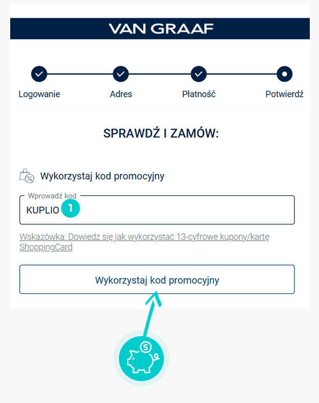 Wybierzcie w e-sklepie Vangraaf.com produkt, który was interesuje, naciśnijcie przycisk "Do koszyka", a produkt automatycznie zostanie dodany do waszego koszyka z zamówieniem. Po prawej stronie, w sekcji "Koszyk" znajdziecie pole "Wykorzystaj kod promocyjny". Tutaj wklejcie skopiowany kod rabatowy bądź wprowadźcie go ręcznie, i zatwierdźcie przyciskiem, a następnie zaznaczcie "Potwierdź zakup".