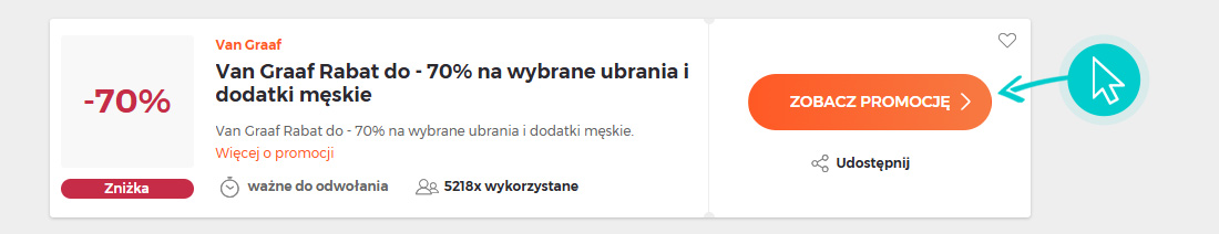 Wybierzcie konkretny rabat z Van Graaf na naszej stronie i kliknijcie przycisk "Zobacz promocję". Zostaniecie automatycznie przekierowani do oferty promocyjnej w sklepie internetowym Vangraaf.com, gdzie możecie kupić wybrany produkt ze świetną zniżką.