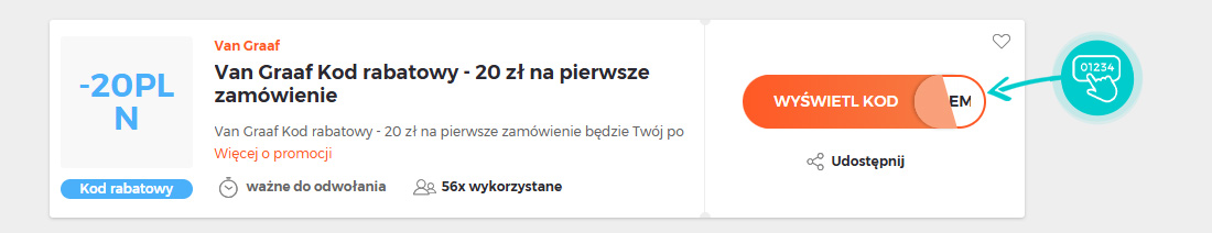 Wybierzcie na naszej stronie konkretny kod rabatowy, którego chcecie użyć w sklepie internetowym Vangraaf.com. Następnie kliknijcie pomarańczowy przycisk "Wyświetl kod".