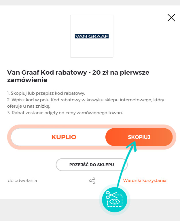 Skopiujcie lub zapiszcie kod rabatowy, a następnie kliknijcie przycisk "Przejdź do sklepu". Zostaniecie automatycznie przekierowani do sklepu internetowego Vangraaf.com.