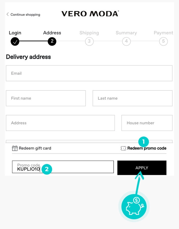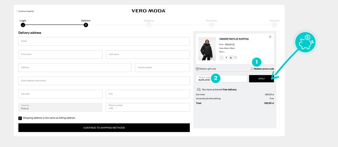 Wybierz w e-sklepie Veromoda.com produkt, który Cię interesuje, naciśnij przycisk "Add to Basket", a produkt automatycznie zostanie dodany do Twojego koszyka z zamówieniem. Po prawej stronie, w sekcji "Checkout" znajdziesz pole "Redeem promo code". Tutaj wklej skopiowany kod rabatowy bądź wprowadź go ręcznie, i zatwierdź przyciskiem, a następnie zaznacz "Continue to shopping methods".