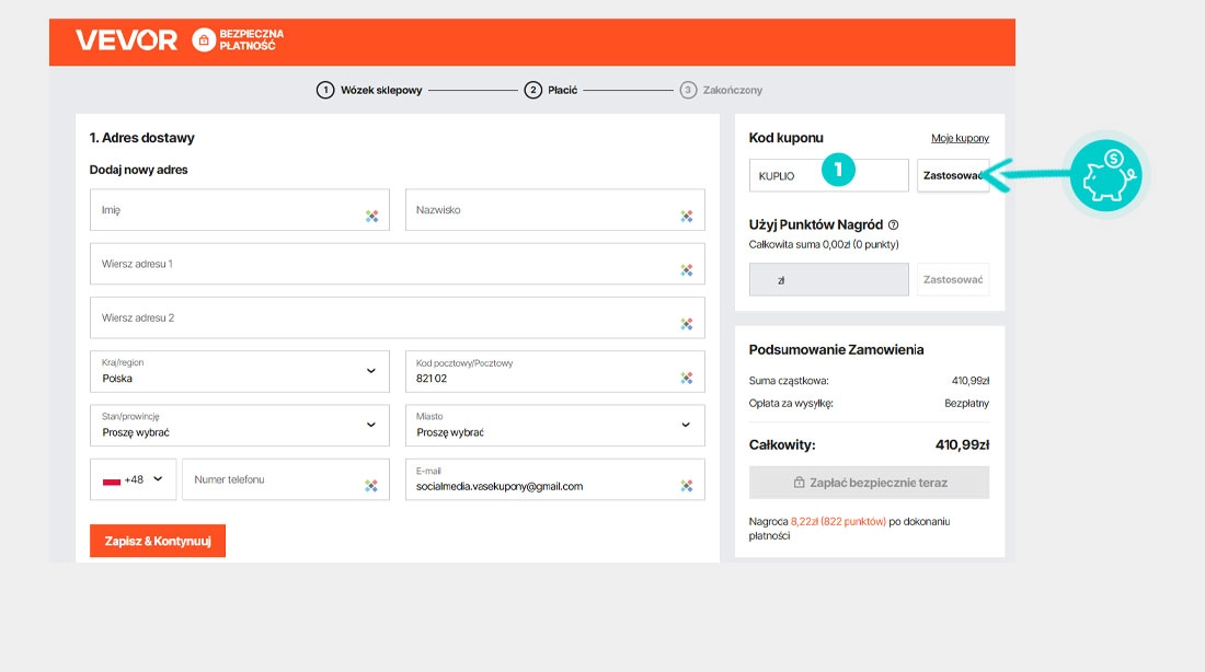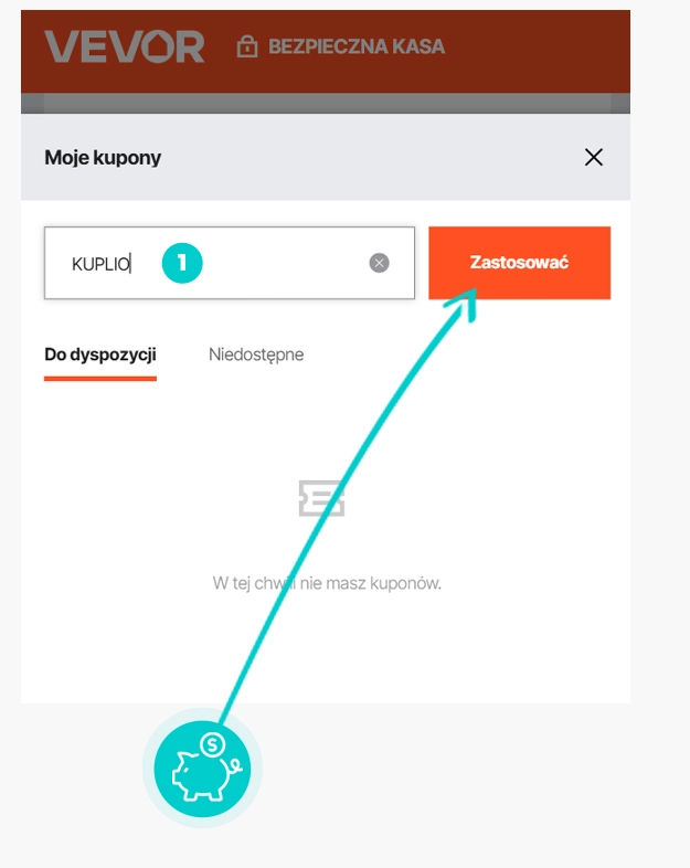 Wybierz produkt w e-sklepie Vevor.pl który Cię interesuje, naciśnij przycisk "Kup", a produkt zostanie automatycznie dodany do koszyka. Bezpośrednio w koszyku znajdziesz pole „Kupon podarunkowy lub rabatowy” pod wybranym produktem. Wpisz tutaj skopiowany kod rabatowy lub wprowadź go ręcznie i potwierdź przyciskiem „Zastosuj”.
