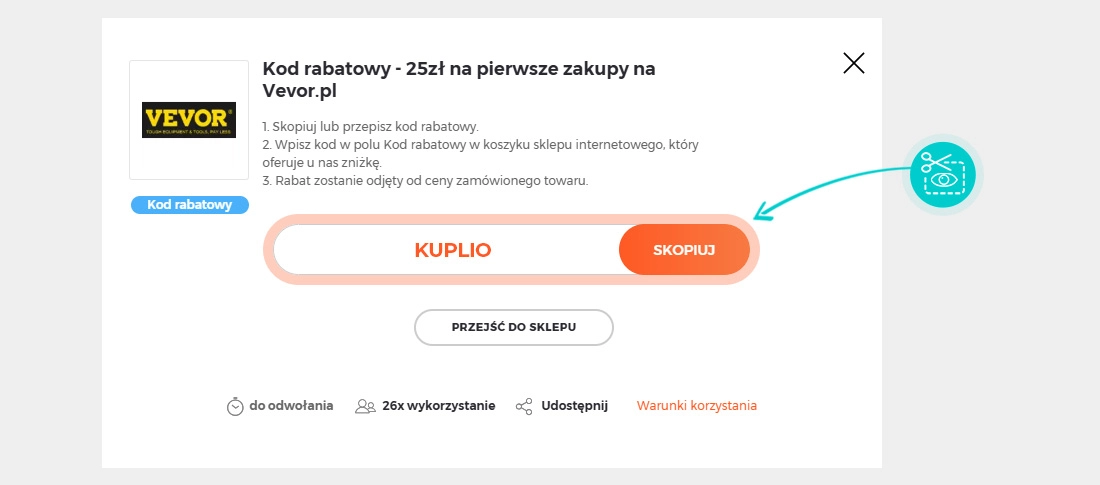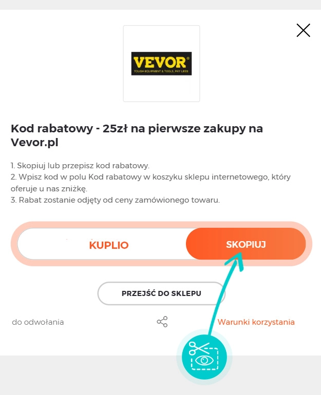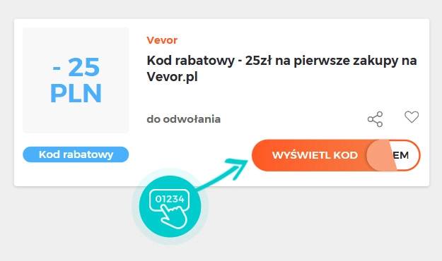 Wybierz na naszej stronie określony kod rabatowy, który chcesz zastosować w sklepie internetowym Vevor.pl. Kliknij pomarańczowy przycisk „Wyświetl kod”.